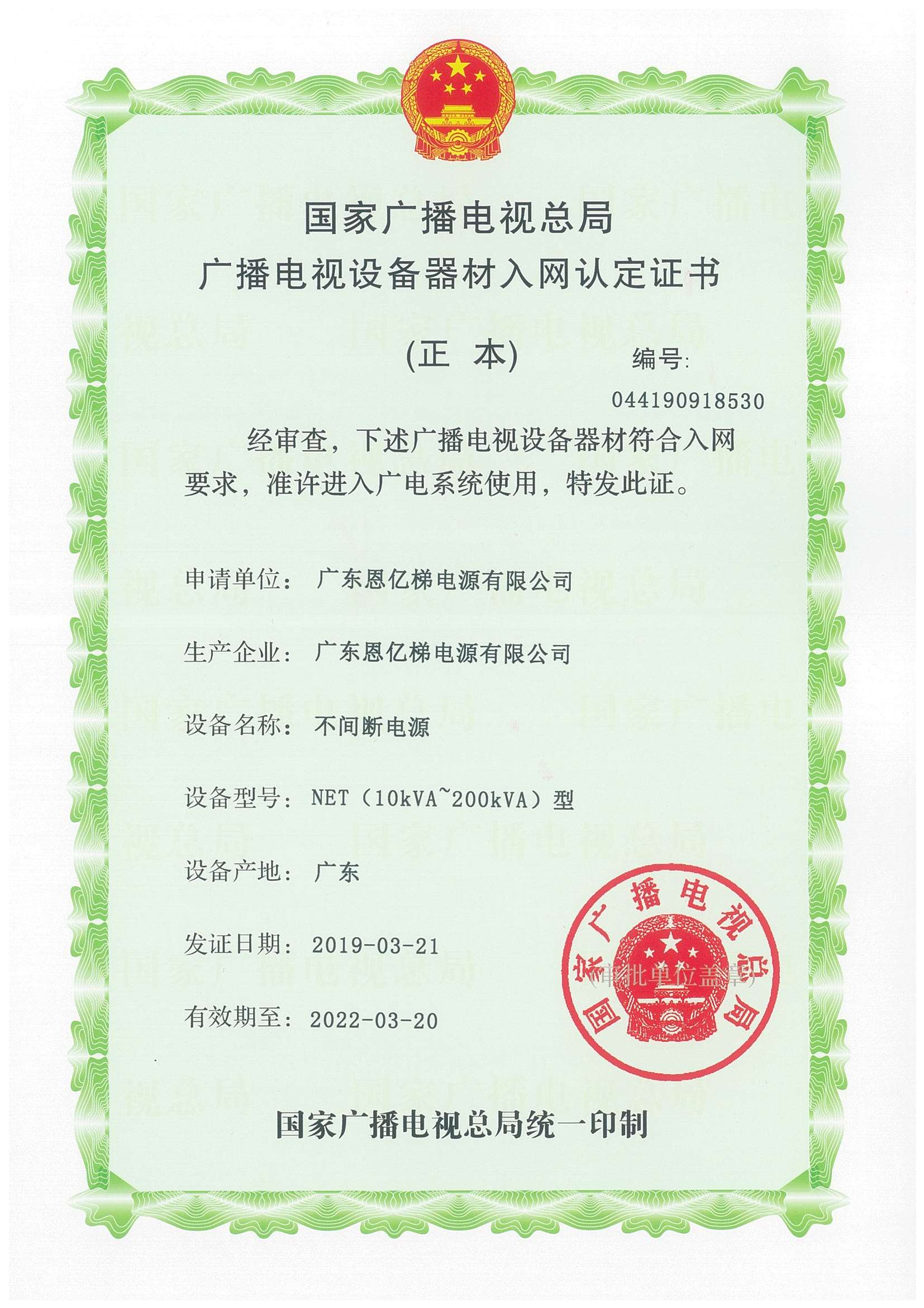 國家廣播電影電視總局入網認定證書(交流穩壓電源)